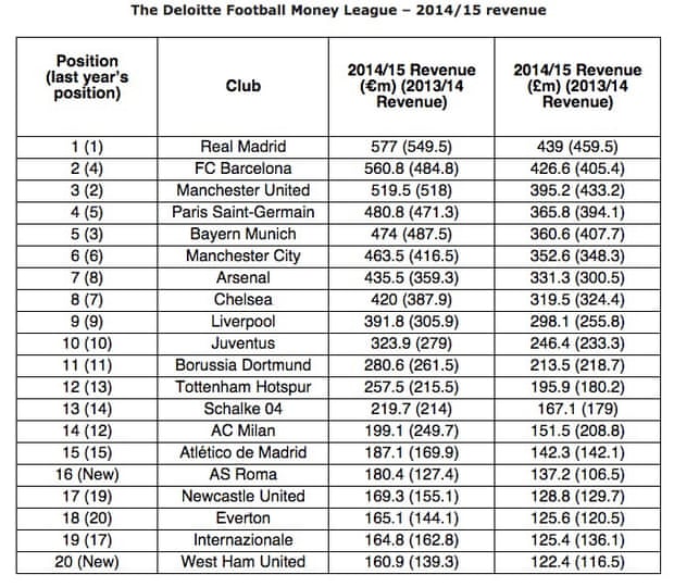 Sempre dal Sole 24ore che cita i dati della Deloitte sui ricavi commerciali 2014/2015